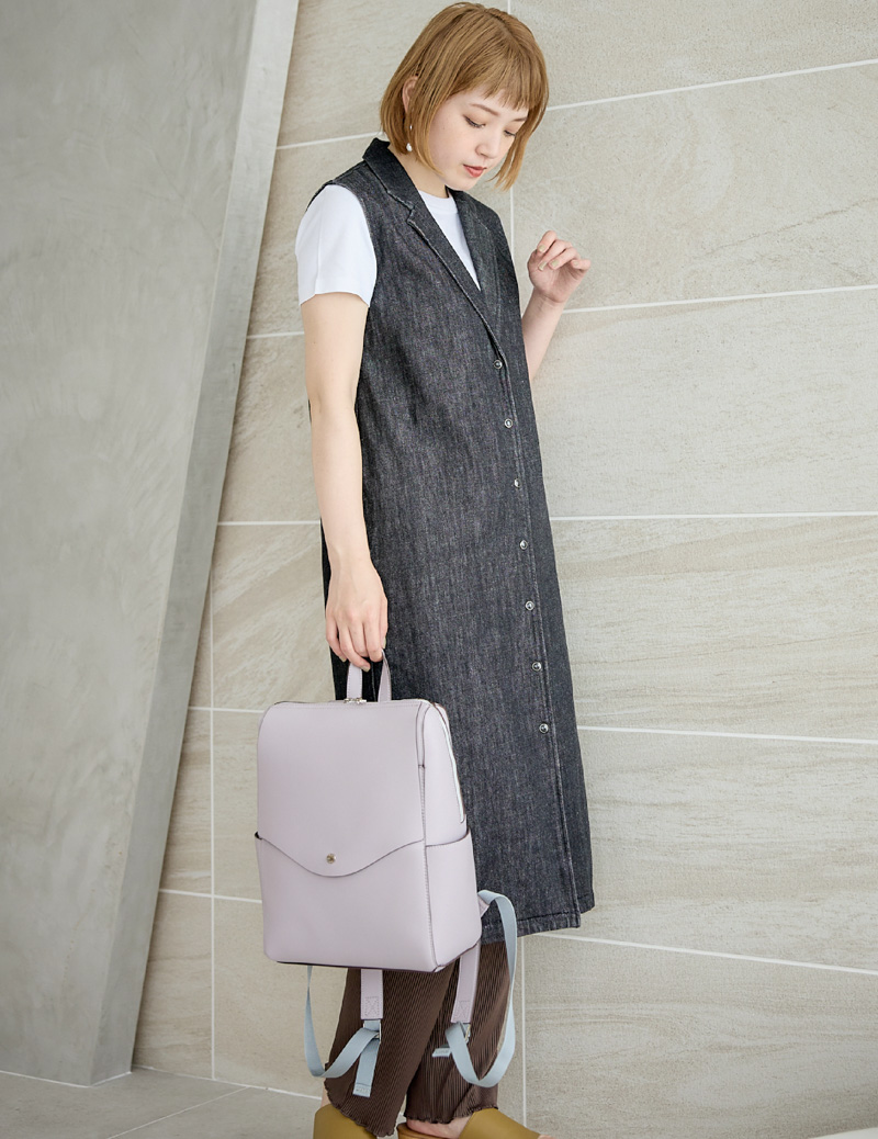 A4サイズが入り、軽量なのが嬉しい縦型リュック。高見えする質感で、お仕事バッグとしても合わせやすい人気のリュックです。